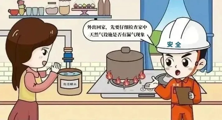外出回家,先要仔細檢查家中天然氣設施是否有漏氣現象,確認無異常后,再啟用燃氣設施及用具。