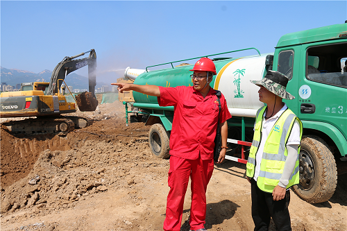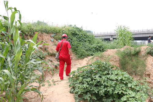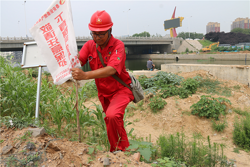 讓巡線員最不放心的,就是隨處可見的施工工地。盡管他們會與工地方主動聯系,給施工方提供燃氣管道位置、走向及埋深,并在現場監護,但是總有一些施工單位不重視,私自開挖、野蠻施工,這也是導致天然氣泄漏的主要原因。在泮河河道改造現場,由于現場開挖涉及燃氣管道安全,宋緒全對管道上方做警示標識,并一再叮囑現場施工管理人員,尤其挖掘機司機注意管道安全,防止施工機械對燃氣管道造成損壞。因各類施工繁多,巡線的工作重心就側重于施工現場巡查及監護,“白加黑,五加二”的模式,在他眼中看來是再尋常不過的事。從去年開始,他們還專門對警示樁進行了補栽。
