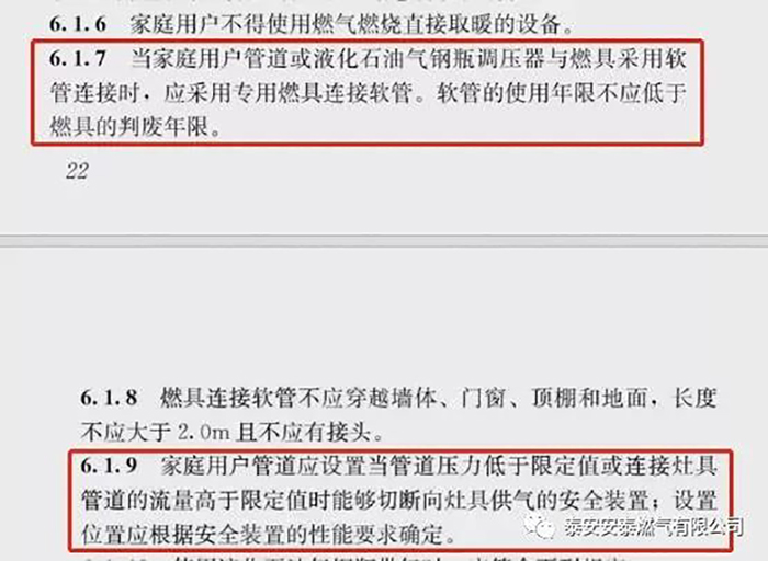 細心閱讀會發現其中第6.1.7條款對于燃氣連接軟管的要求出現了很大的新變化:“當家庭用戶管道或液化石油氣鋼瓶調壓器與燃具采用軟管連接時,應采用專用燃具連接軟管。軟管的使用年限不應低于燃具的判廢年限”。