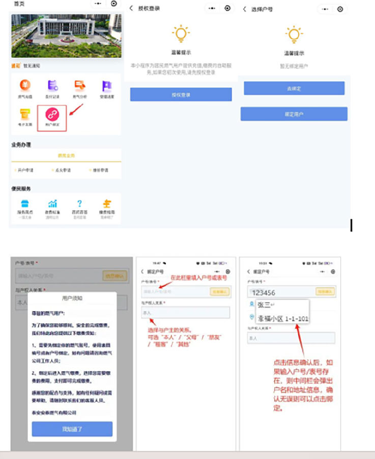 ? 全部綁定完成后,點擊首頁的“用戶綁定”可查看并切換當前登錄的燃氣賬戶。